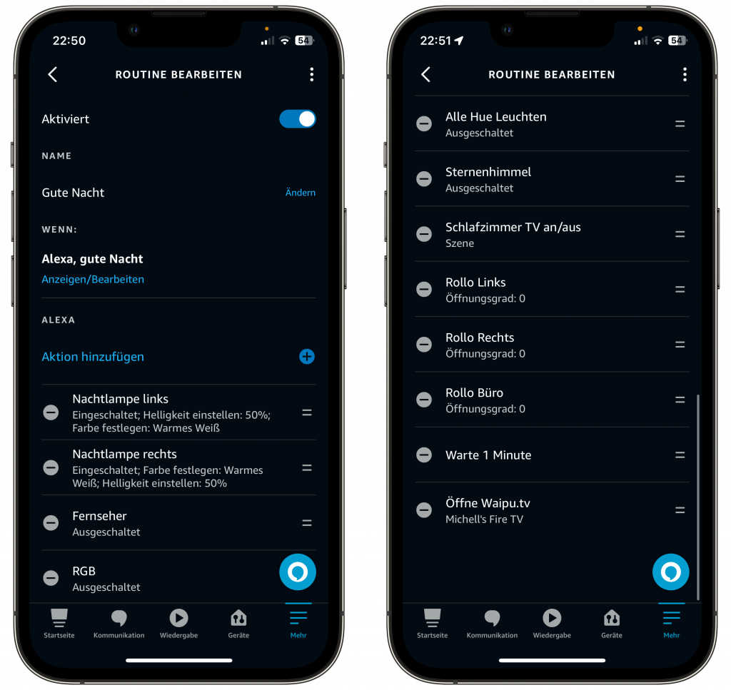Meine Gute Nacht Routine starte ich in der Regel, wenn ich mein Wohnzimmer verlasse und ins Bad gehe. Der Trigger für meine Alexa Gute Nacht Routine ist der Sprachbefehl „Alexa, gute Nacht“. Als erstes sollen meine beiden Nachtlampen im Schlafzimmer eingeschaltet werden. Hier verwende ich günstige E27 WLAN-Glühbirnen, welche ich noch aus alter Verwendung übrig hatte. Es werden also beide Lampen in den Aktionen hinzugefügt und die Zustände „Einschalten“, „Helligkeit 50%“ und „Warmes Weiß“ gewählt. Finde ich persönlich am angenehmsten.