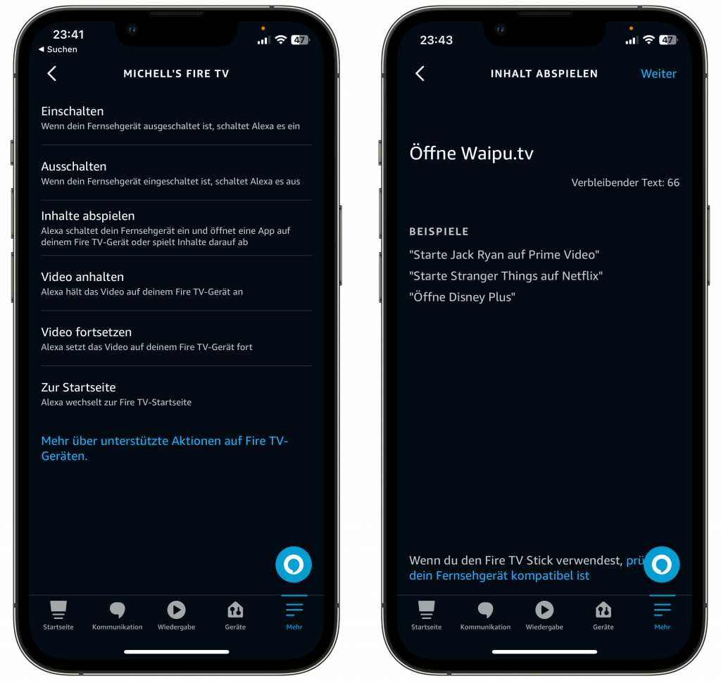 Zu guter Letzt soll auf dem Fernseher in meinem Schlafzimmer „waipu.tv“ gestartet werden. Da der Fire TV Stick etwas Zeit braucht um hochzufahren, habe ich noch die Aktion „Warten“ mit eingebaut, aktuell habe ich hier eine Minute eingestellt was super funktioniert.